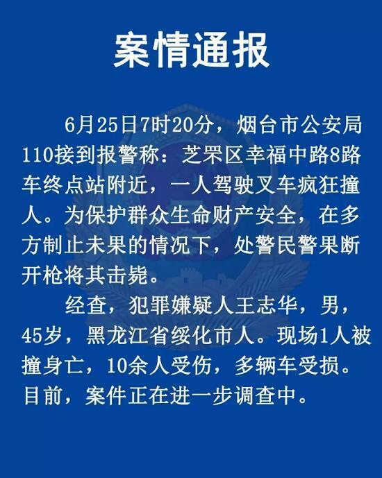 【案情通报】6月25日7时20分,烟台市公安局110接到报警称:芝罘区幸福中路8路车终点站附近,一人驾驶叉车疯狂撞人。为保护群众生命财产安全,在多方制止未果的情况下,处警民警果断开枪将其击毙。经查,犯罪嫌疑人王志华,男,45岁,黑龙江省绥化市人。现场1人被撞身亡,10余人受伤,多辆车受损。目前,案件正在进一步调查中。