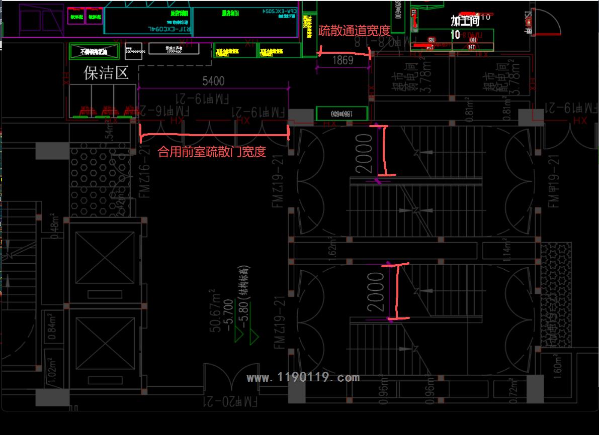 某地下一层商业超市平面布局图中,疏散走道宽度为1.87米。前室的疏散门5.4米,楼梯间疏散宽度4米,请问疏散走道的宽度是否可以按最低标准人密场所不低于1.4米,是否符合规范要求?如不符合,有没规范条文解释?疏散走道 疏散楼梯门 楼梯宽度三者是否都要同时符合按按最小的标准算疏散宽度?