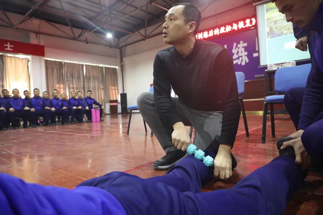 授课过程中,曹爱斌教授系统讲解了训练后肌肉情况、神经反应、内脏变化等方面的基础理论,并对主动、被动恢复的原理、手段和效果进行了详细讲解。同时针对队伍现用的放松方式进行了逐动动作讲解规范,对队员存在的疑问进行了细致解答。