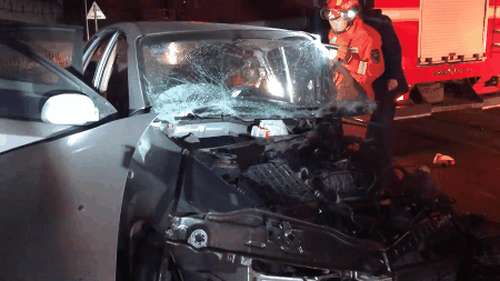 经侦查,现场为一辆轿车撞到隔离带,导致司机被困,消防员利用液压顶杆、剪扩器等救援工具对事故车辆进行破拆救人。