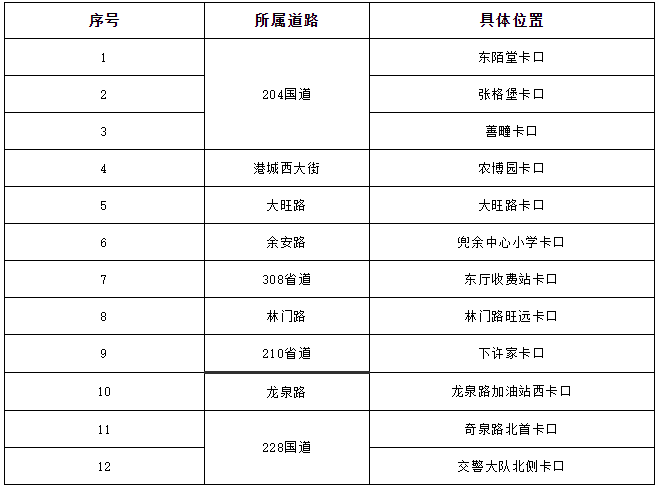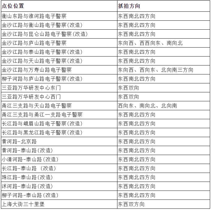 一、 违反道路交通信号灯通行、进入路口不按导向车道行驶、违反禁止标线指示、逆行等违法行为抓拍监控设备设置点: