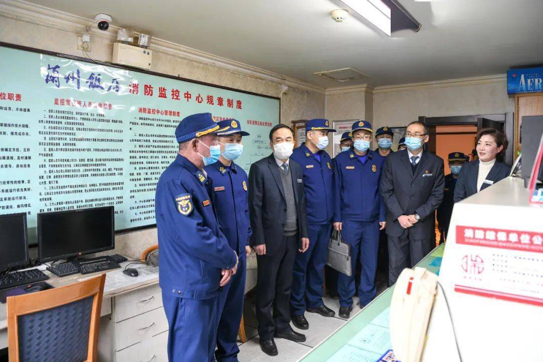 1月11日下午,甘肃省消防救援总队副总队长申立新率检查组先后深入甘肃大剧院、皇冠假日酒店、陇能大酒店、兰州饭店、飞天酒店、宁卧庄宾馆、万达文化酒店等省“两会”涉会场馆,检查指导省“两会”消防安全工作,总队、兰州支队相关人员陪同检查。