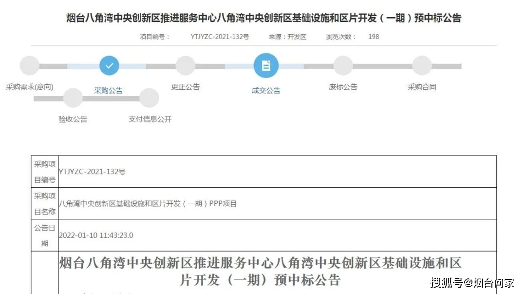 1月10日,烟台公共资源交易网发布:烟台八角湾中央创新区推进服务中心八角湾中央创新区基础设施和区片开发(一期)PPP项目招标公告。