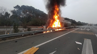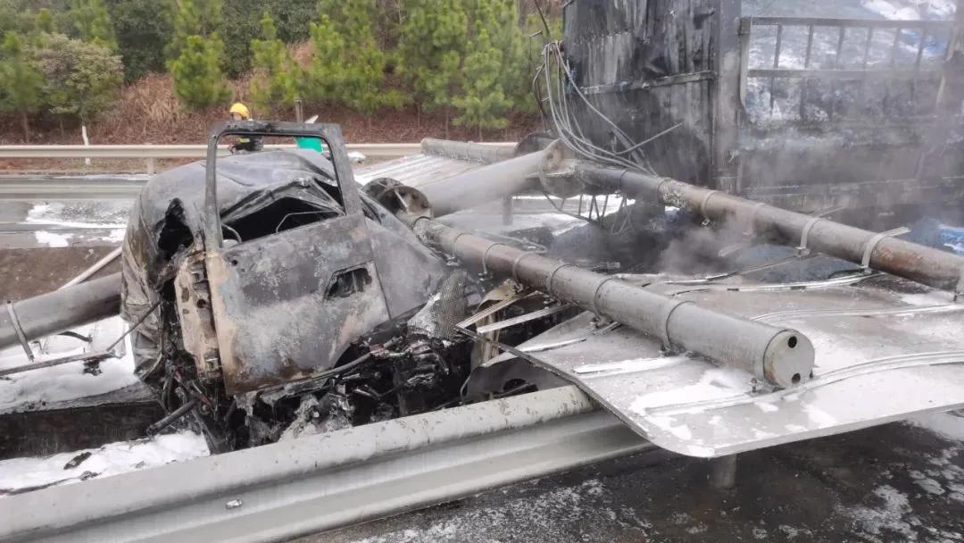 据驾驶员介绍,他和另一名驾驶员轮流驾驶,疑似因打瞌睡导致车辆撞倒了路边交通指示牌和护栏,随后燃起了熊熊大火。车上2人及时撤离,其中1名驾驶员头部受伤,所幸没有生命危险。