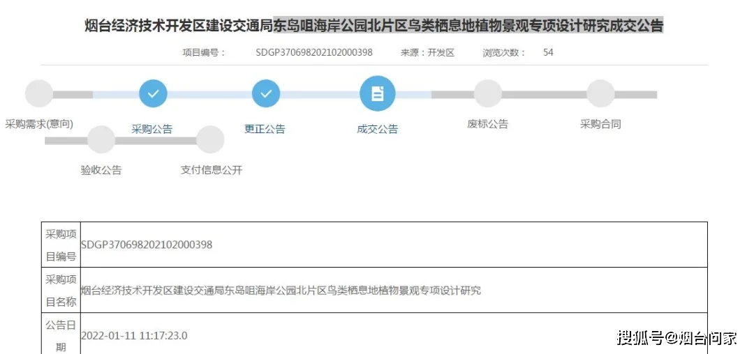 1月11日,烟台公共资源交易网发布:东岛咀海岸公园北片区鸟类栖息地植物景观专项设计研究成交公告。