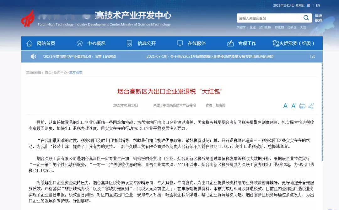 烟台久联工贸有限公司是烟台高新区一家专业生产加工钢格板的外贸出口企业。烟台高新区税务局通过增值税发票等税收大数据分析,根据该企业特点实行“一企一策”的个性化涉税服务,“一对一”推送税收优惠政策,直击企业需求点。2021年以来,烟台高新区税务局共为久联工贸办理出口退税12笔,办理出口退税421.15万元。