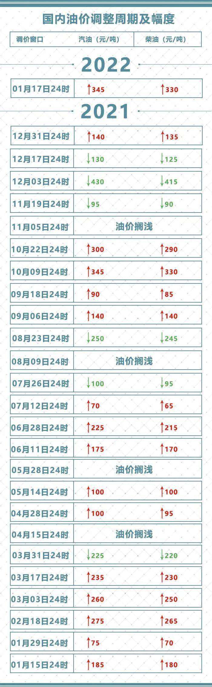 央视财经记者从国家发改委获悉,本次油价调整具体情况如下: 国内汽、柴油价格每吨分别提高345元和330元。
