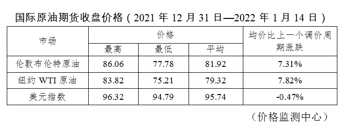 据国家发改委价格监测中心监测,本轮成品油调价周期内(2021年12月31日—2022年1月14日)国际油价大幅上涨。平均来看,伦敦布伦特、纽约WTI油价比上轮调价周期上涨7.57%。受此影响,国内汽油、柴油零售价随之上调。
