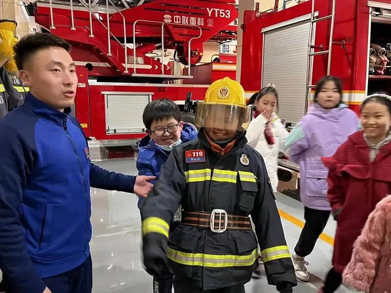 走进消防站,师生们在队员的引领下,从消防车辆、装备器材的性能等方面简要地进行了介绍。面对不同的消防车辆和装备,学生们充满了好奇心,产生了浓厚的兴趣,不停地指这指那进行询问。对于学生们提出的一些问题,队员都一一做了详细地解答。在执勤车辆库内,学生们参观了消防车、消防器材装备等,有的学生们还兴致勃勃的穿上了战斗服,戴上了消防头盔、消防手套,当了一回“消防员”。同时,队员还针对学生活泼好动的特点,重点讲解了玩火的危险性,提醒学生们不要随意用火,避免意外发生。随后,学生们来到党建荣誉室,队员为学生讲述了我们来之不易的伟大祖国,提高了学生的思想政治觉悟,激发了爱国热情。