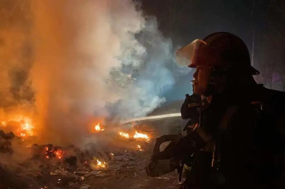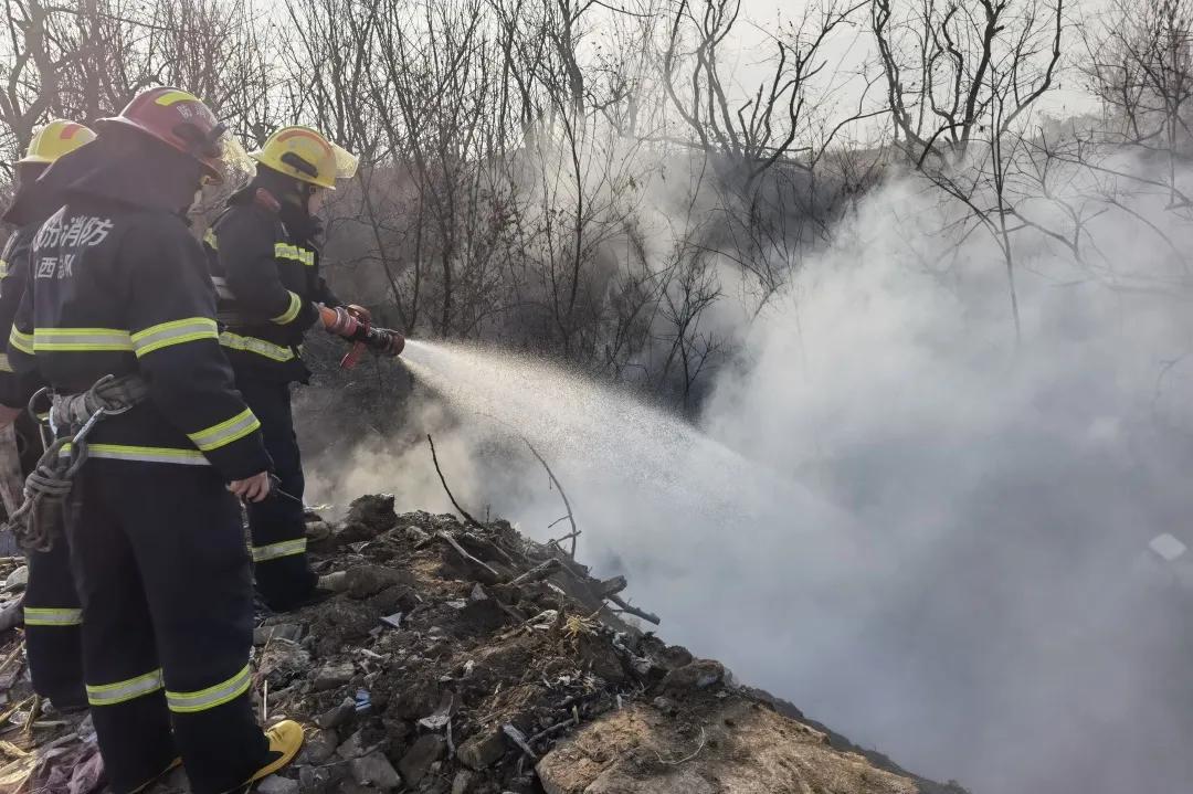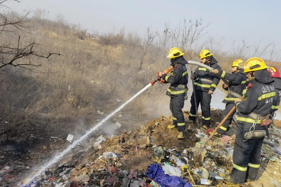 村边沟槽内垃圾场着火救援