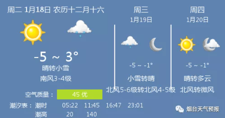 早上好,今天是1月18日,星期二,农历十二月十六,数九为四九第2天。烟台天气:晴转小雪,温度 -5 ~ 3℃,南风3-4级,日出时间 07:09,日落时间 17:05,降雨量 0.0mm,湿度 58%RH。实时:晴,气温 -5℃,西南风1级,湿度 53%RH,气压 1015Pa,紫外线强度 1级,能见度 30000米。