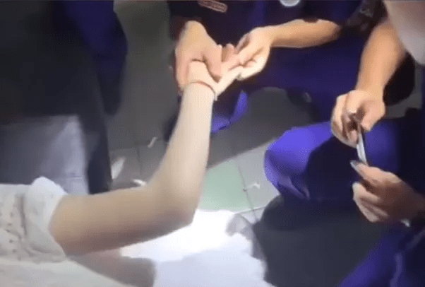 7月8日,山西晋中一女士戒指卡手,救援过程中情绪激动一直喊疼,因过于紧张无法配合施救。周围十个消防员围着,为其扇风、安慰、唠嗑,分散女子的注意力。