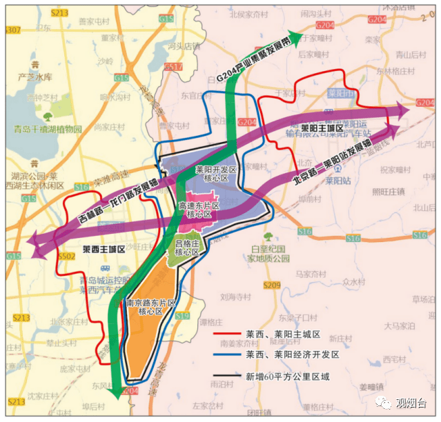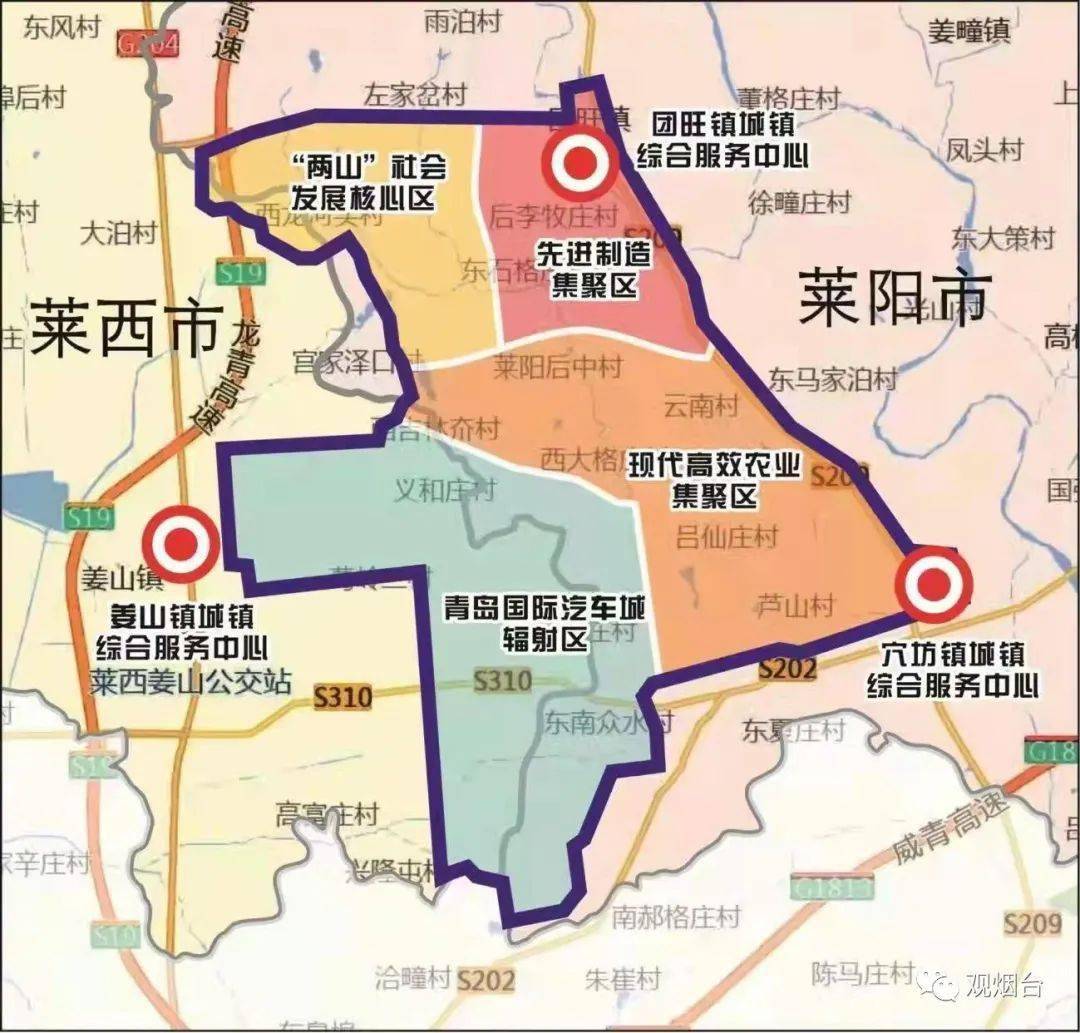 “两区引领”,发挥毗邻优势,两市中心城区规划打造面积160平方公里的产城融合联动区;莱西姜山与莱阳团旺等区域规划打造面积100平方公里的城乡融合联动区。