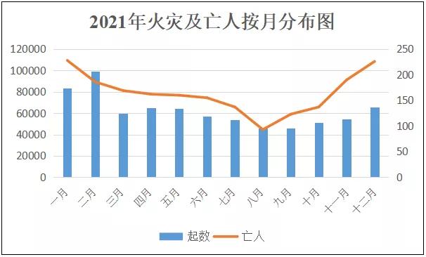 冬春火灾高发,夜间亡人集中。 从火灾的季节分布看,冬春季节共发生火灾43.7万起,亡1131人,分别占总数的58.6%和57.5%,明显多于夏秋,特别是春节期间为全年的火灾高峰,除夕当天的火灾相当于平常的近3倍。从火灾时段分布看,10时至20时是全天的火灾多发期,占火灾总数的61.2%,但亡人数只占33.9%;而夜间22时至次日6时的火灾只占总数的17.3%,但亡人数占41.9%,较大火灾数占51.2%。