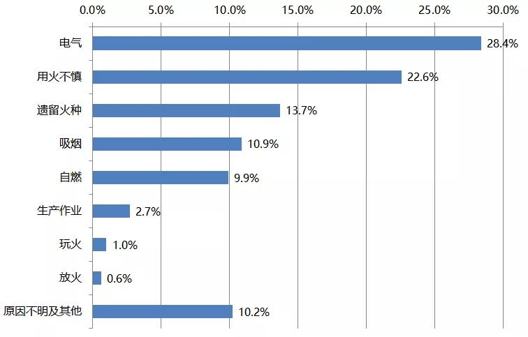 电气仍是引发火灾的首要原因,生产作业火灾易致人员伤亡。从引发火灾的直接原因看,因电气引发的占28.4%,而较大以上火灾则有三分之一系电气原因引起,且以电气线路故障居多,占电气火灾总数的近八成。除电气外,其它原因导致火灾的比例为:用火不慎22.6%、遗留火种13.7%、吸烟10.9%、自燃9.9%、生产作业2.7%、玩火1%、放火0.6%、原因不明及其他10.2%。其中,违规动火施工、焊接焊割等生产作业火灾仅占总数的2.7%,但造成的亡人却占总数的6.3%,引发的较大火灾占总数的10.7%。