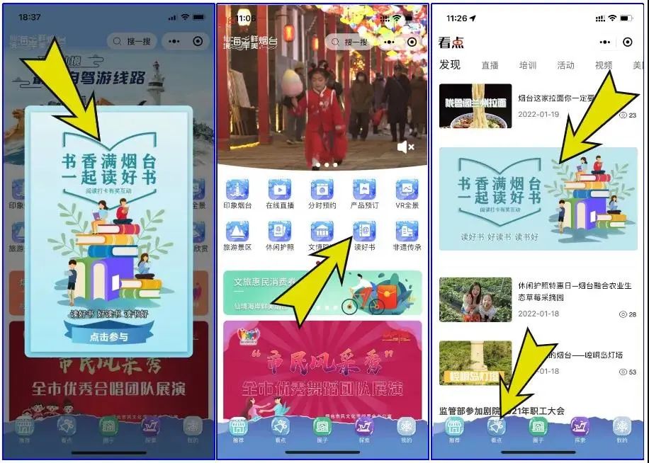 或微信搜索“烟台文旅云”小程序,点击弹窗、首页读好书或看点活动入口(如图所示),进入全民阅读平台。