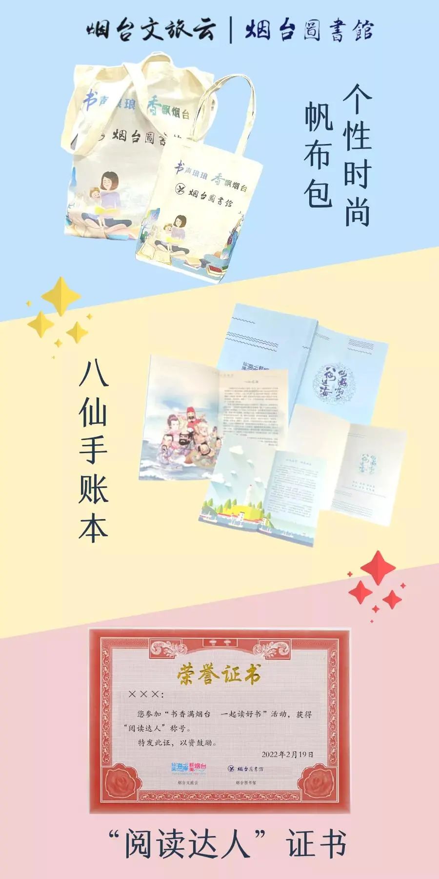 2.累计打卡成功满7天、14天可分别获得一次抽奖机会,有机会获得八仙手账本(共100本)、个性化时尚帆布包(共100个)或数额不等的烟台文旅云积分(积分可用于“积分商城”礼品兑换); 打卡成功21天及以上可获得由烟台图书馆颁发的“阅读达人”证书。