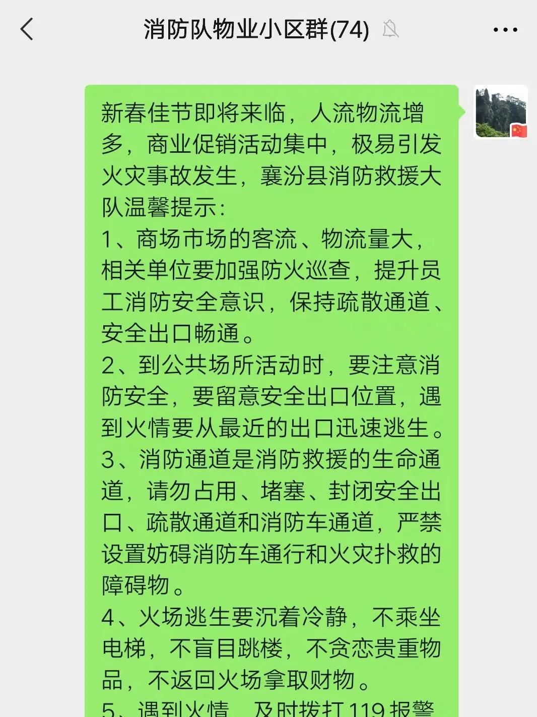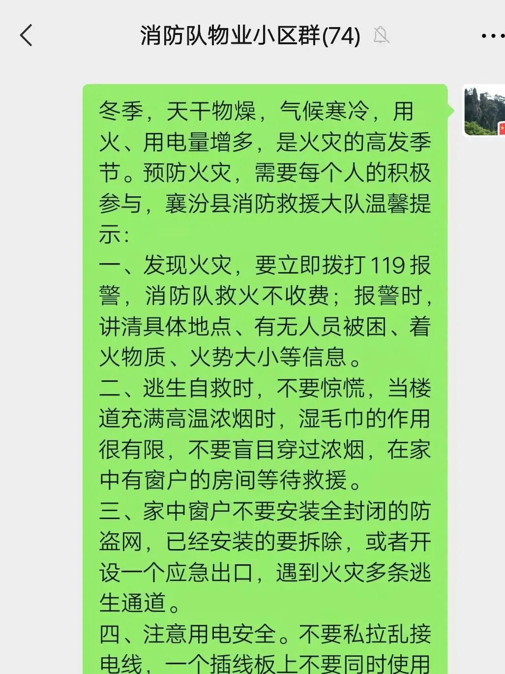 大队充分利用微信互动性强、信息传播快等特点,定期在物业小区微信群内发送家庭防火注意事项、火场逃生技能、节前安全要点等知识,进一步拓宽消防宣传覆盖面,让消防安全意识扎根于广大群众的心中。