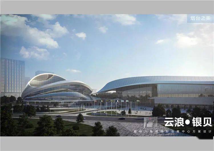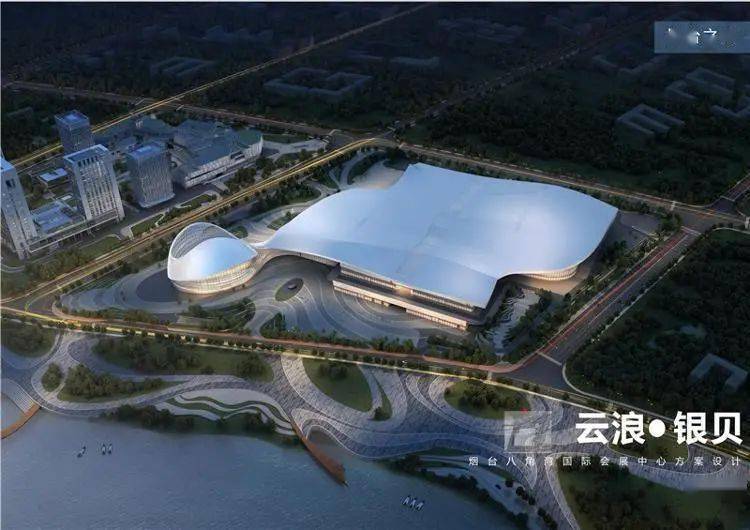 据了解,烟台八角湾国际会展中心由业达城市发展集团承建,方案由美国著名设计公司AECOM根据第五代会展综合体定位设计,方案以“城岸云浪·海上银贝”为设计理念,将烟台的碧海与蓝天相接,海浪与白云相交融,再融入轻盈的银贝,最终演化出建筑结构与造型相互统一、结构清晰的,集会展区、会议区和配套商业区为一体的烟台八角湾国际会展中心。