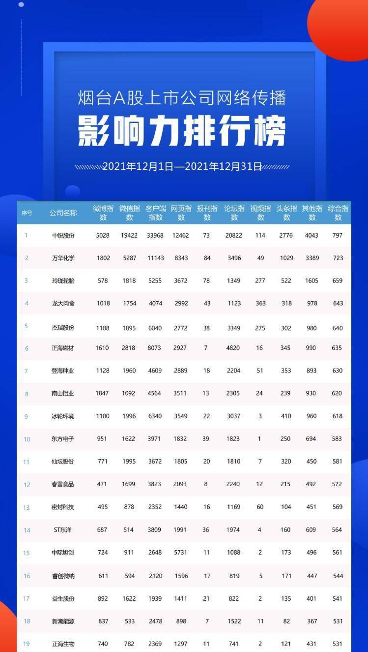 2021年12月份烟台A股上市公司网络传播影响力排行榜出炉!黑马“中锐股份”一骑绝尘
