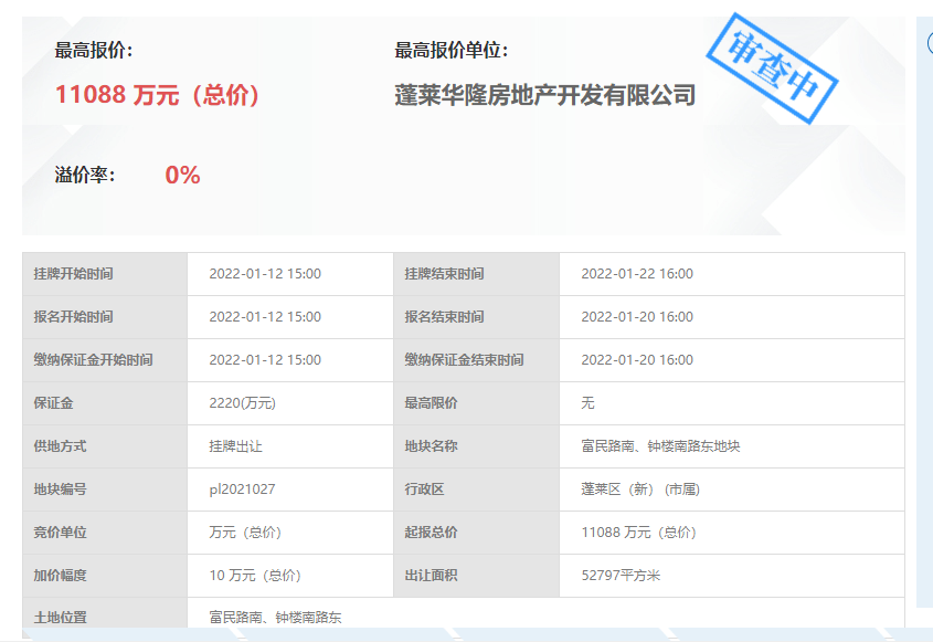 1月22日,蓬莱区富民路南、钟楼南路东地块挂牌截止,由蓬莱华隆房地产开发有限公司底价揽获,成交总价11088万元,成交楼面价1391元/平。