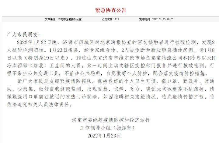 2022年1月22日晚,济南市历城区对北京通报协查的密切接触者进行核酸检测,发现2人核酸检测阳性。1月23日凌晨,经专家组会诊,2人被诊断为新冠肺炎确诊病例。 请1月8日以来(特别是19日以来),到过山东省济南市维尔康市场鱼宝宝物流公司和H冷库以及H冷库西邻(路北)卫生间的人员,第一时间主动向辖区疾控部门报备并进行核酸检测。行程不乘坐公共交通工具,不前往公共场所,自觉做好个人防护,配合落实疫情防控措施。