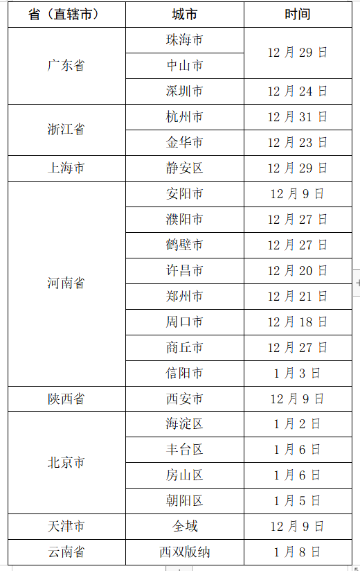 12月4日以来陕西省西安市,12月6日以来陕西省延安市,12月8日以来河南省周口市、陕西省咸阳市、山西省运城市,12月9日以来天津市、河南省鹤壁市、安阳市、濮阳市,12月17日以来河南省洛阳市,12月20日以来河南省许昌市,12月21日以来河南省郑州市,12月22日以来河南省信阳市,12月23日以来浙江省金华市,12月24日以来广东省深圳市,12月25日以来河南省其他地区,12月29日以来广东省中山市、珠海市,12月31日以来杭州市,1月2日以来北京市海淀区、上海市静安区,1月5日以来北京市朝阳区,1月6日以来北京市房山区、丰台区,1月8日以来云南省西双版纳傣族自治州旅居史来牟返牟人员, 1月10日以来北京市丰台区接触过冷链的人员,其他地区中高风险地区来牟返牟人员,各地公布感染者同时空伴随人员,或自身健康码、行程卡出现红码或黄码等情况的,请第一时间主动向所在地社区(村居)、工作单位或所住酒店报备,按要求落实管控措施和相应核酸检测要求。因瞒报、虚报或未按规定落实防控措施,引发新冠肺炎疫情传播风险或其他严重后果的,将依法追究责任。
