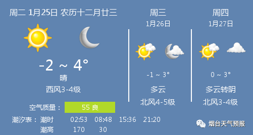 早上好,今天是1月25日,星期二,农历十二月廿三,今日小年,数九为四九第9天。烟台天气:晴,温度 -2 ~ 4℃,西风3-4级,日出时间 07:05,日落时间 17:13,降雨量 0.0mm,湿度 67%RH。实时:阴,气温 -1℃,西风2级,湿度 69%RH,气压 1008Pa,紫外线强度 1级,能见度 9600米。