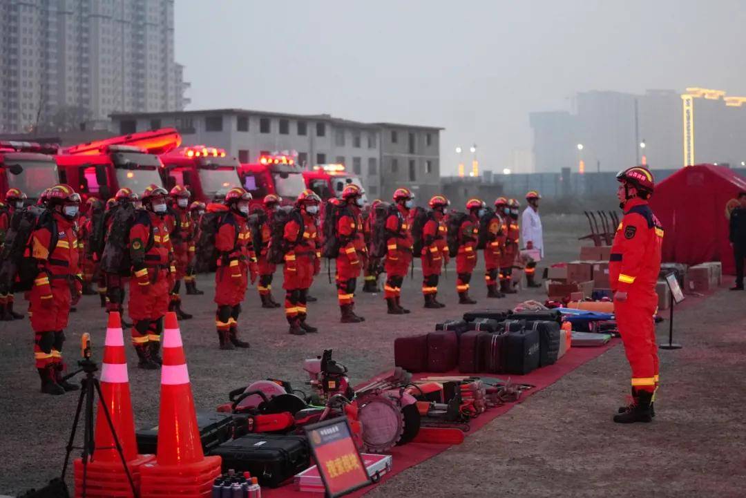 14时17分,接到总队调度命令后,由副支队长兼灭火救援指挥部部长王进带领支队地震救援轻型专业队60名队员、2头搜救犬、2辆指挥车、1辆运兵车、1辆器材装备运输车、4辆水罐车、3辆抢险救援车、1辆餐饮保障车、1辆防化洗消车、1辆供气消防车、4651余件套器材装备及72小时自我保障物资迅速赶赴指定柳河东路特勤站集结。随后,王进副支队长向全体参战队员召开了简短的誓师动员大会,要求全体参战队员要将此次地震救援拉动演练作为检验支队地震救援专业队能力的重要标尺,要以最高昂的士气、最严格的标准、最精准的技能圆满完成此次救援任务。