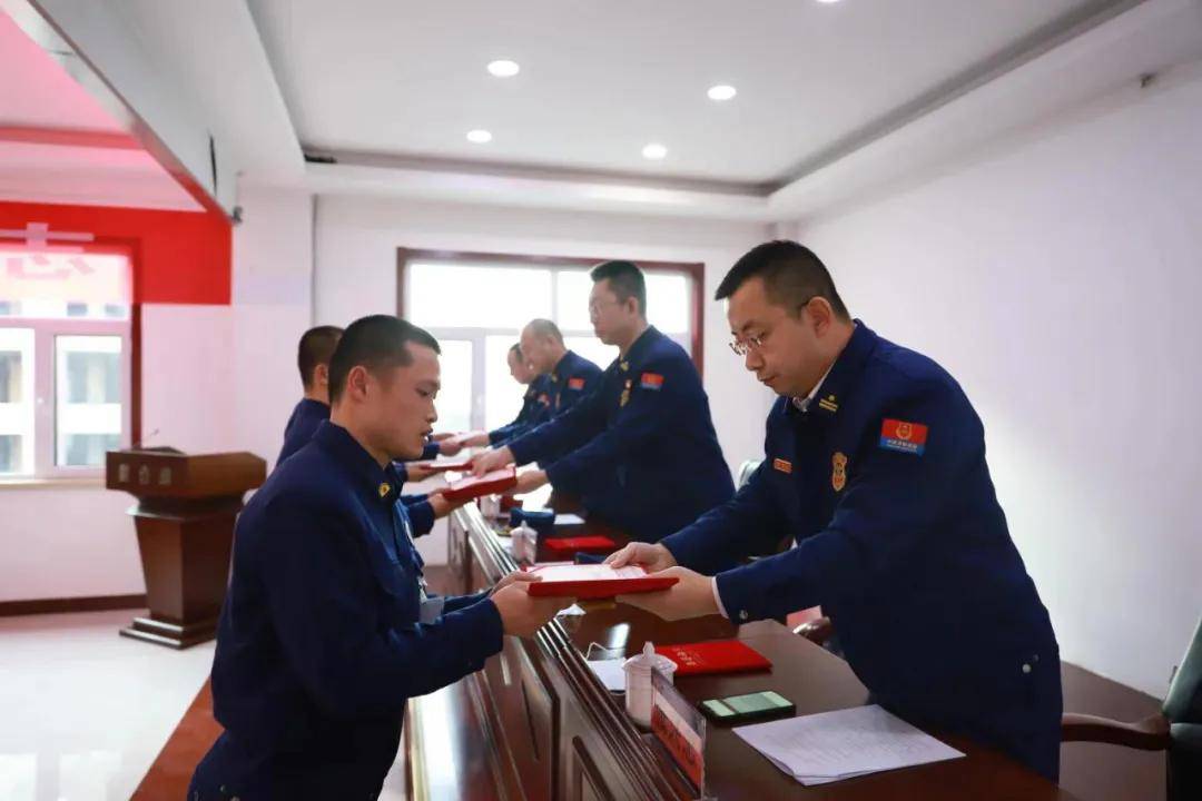 仪式在庄严的国歌声中拉开序幕。培训大队大队长薄天军总结讲评入职培训工作开展情况,培训大队教导员张兴忠宣读入职培训工作表彰决定,政治部队务科科长郭武忠宣读《大同市消防救援支队新招录专职消防队员岗前分配实施方案》,与会领导为获奖的专职消防队员代表颁发荣誉证书。万华副政委在讲话中指出,2021年度新招录政府专职消防队员入职培训工作取得圆满结束,下队后各单位要将新招录专职队员穿插分配至各战斗班,要以战斗班为单位相对集中,岗前实训期间与消防救援站指战员实行同吃、同住、同劳动、同娱乐、同操课,不允许单独执行灭火救援作战任务。