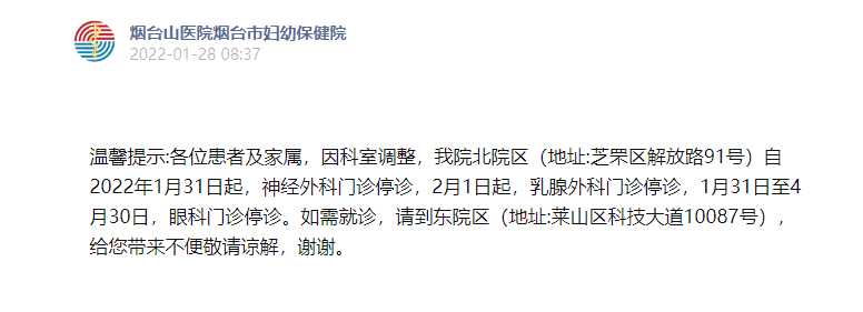 因科室调整,烟台山医院北院区(地址:芝罘区解放路91号) 自2022年1月31日起,神经外科门诊停诊,2月1日起,乳腺外科门诊停诊,1月31日至4月30日,眼科门诊停诊。如需就诊,请到东院区(地址:莱山区科技大道10087号)。