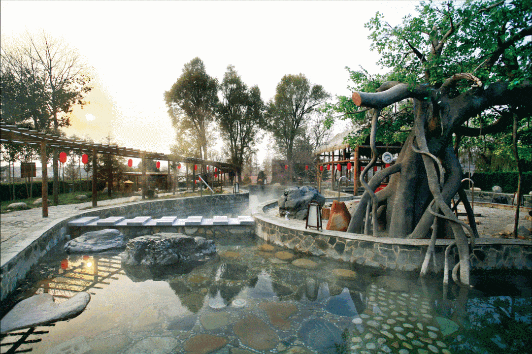 这些汤池错落有致地分布于静谧的园林山水间,曲径通幽处,古亭掩映,清风拂面来,流水潺潺。在露天温泉区感受暖暖的阳光,呼吸着沁人心脾的空气,让身心的疲惫与尘世的烦扰尽数消融于泉水中。