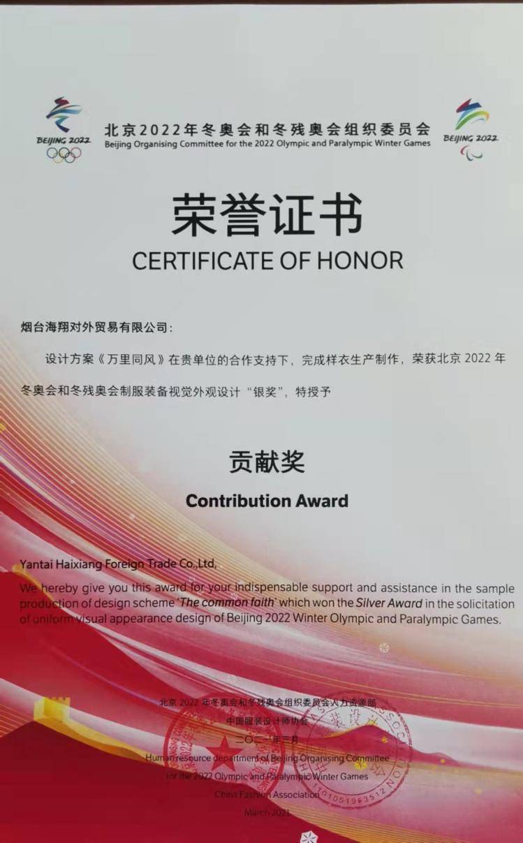 “万里同风”方案充满了中国式浪漫,凝聚着烟台工业设计的智慧。2020年6月,该方案在全球600套设计方案中,杀出重围进入十强。2020年9月29日,北京冬奥组委组织召开十进五评审会议,烟台海翔研发团队通过模特着装动态展示、现场陈述等环节,将服装主题理念、文化内涵、面料版型、功能特点亮点做了全方位互动展示。“万里同风”方案进入五强。2020年11月27日,北京冬奥组委组织召开第三次评审会,最终海翔方案和样衣凭借新颖的外观、突出的设计、完善的功能获得银奖,被北京奥组委和中国服装设计师协会授予“贡献奖”。