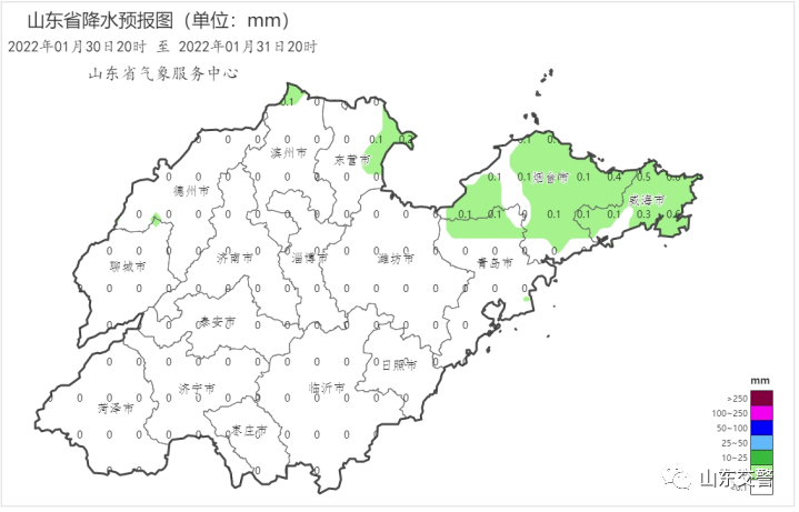 除夕(31日), 半岛北部地区天气多云间阴有小雪,其他地区天气多云转晴。半岛地区南风4~5级阵风6级转北风5~6级阵风7级,其他内陆地区北风3~4级。渤海、渤海海峡、黄海北部和中部南风5~6级转北风7级阵风8~9级。最高气温:鲁西北、鲁中山区和半岛北部地区2~4℃,其他地区5~7℃;最低气温:鲁南和沿海地区-3~-1℃, 其他地区-7~-5℃。