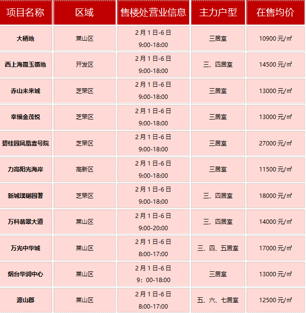 据了解,烟台市共有11家实体售楼处将在2月1日-6日春节期间照常营业,也有几家售楼处在初三、初四开始正常营业,各种春节限定优惠和福利届时也将悉数登场。