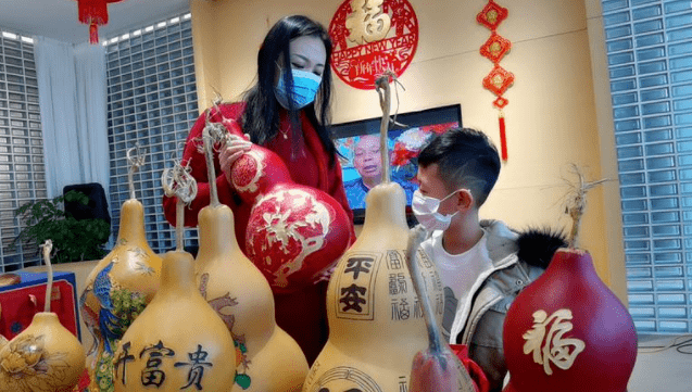 2月1日,葫芦雕刻艺人刘伟在烟台市非遗文化馆给小朋友介绍葫芦文化。当日是正月初一,烟台市非遗文化馆“非遗让生活更美好”主题文化展,吸引了不少市民前来参观,沉浸式感受非遗文化魅力,喜迎虎年新春的到来。(记者 申吉忠 摄影报道)