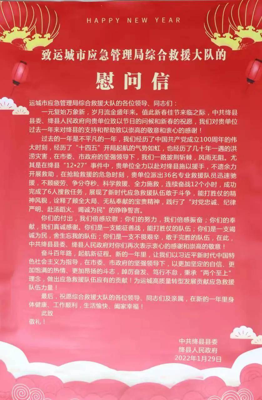 马辉代表绛县县委、县政府为运城市应急救援大队送来慰问信,并为指战员们送来慰问品,为他们在12·27事故救援中迅速驰援、争分夺秒、不顾疲劳、科学施救、无私奉献的精神表示感谢。