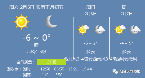 早上好,今天是2月5日,星期六,农历正月初五,今日春节-假日第6天,数九为六九第2天。烟台天气:晴,温度-6 ~ 0℃,西风4-5级,日出时间06:56,日落时间17:25,降雨量0.0mm,湿度45%RH。
