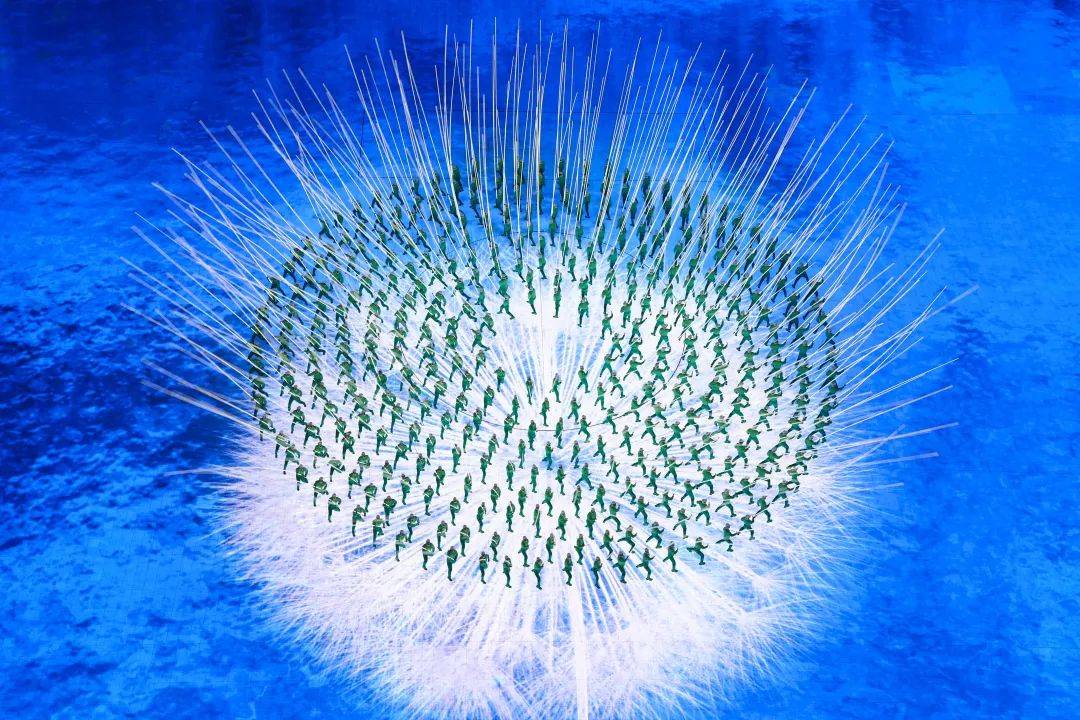 在《立春》的尾声部分,发光杆由绿变白,一朵巨大的蒲公英在鸟巢中绽放,接着被地面影像中出现的小孩吹散。这一浪漫空灵的景象正是在营造冬天里雪花飞舞的氛围,而蒲公英的种子被播撒到各个角落,也蕴含着万物复苏的立春气象。