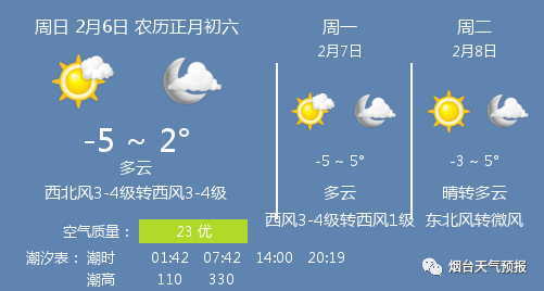 早上好,今天是2月6日,星期日,农历正月初六,今日春节-假日第7天,数九为六九第3天。烟台天气:多云,温度 -5 ~ 2℃,西北风3-4级转西风3-4级,日出时间 06:56,日落时间 17:26,降雨量 0.0mm,湿度 49%RH。实时:晴,气温 -1℃,西风2级,湿度 41%RH,气压 1015Pa,紫外线强度 1级,能见度 30000米。