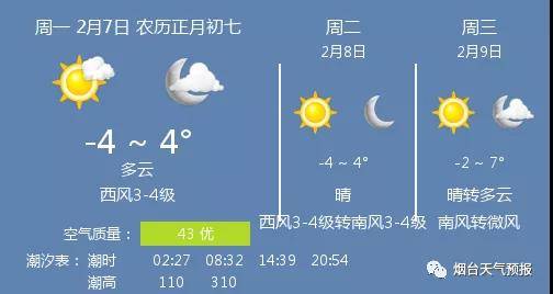 早上好,今天是2月7日,星期一,农历正月初七,数九为六九第4天。烟台天气:多云,温度 -4 ~ 4℃,西风3-4级,日出时间 06:55,日落时间 17:27,降雨量 0.0mm,湿度 49%RH。实时:阴,气温 -4℃,西南风1级,湿度 57%RH,气压 1014Pa,紫外线强度 1级,能见度 21500米。
