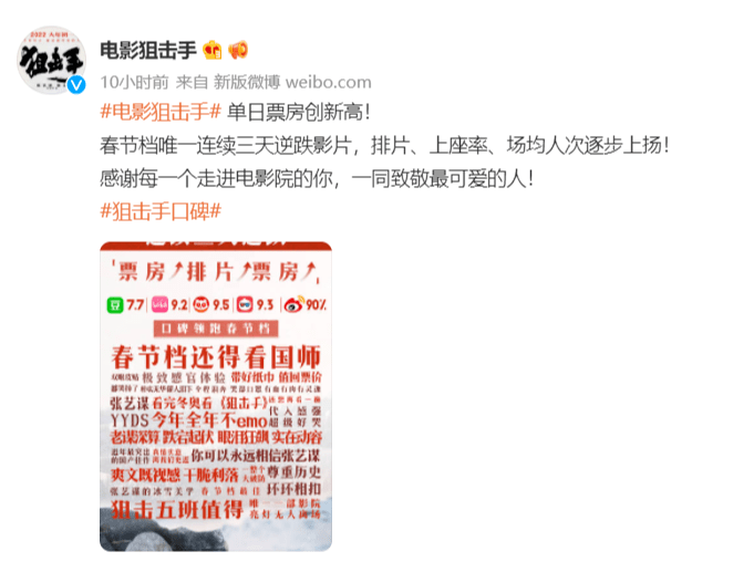 电影狙击手的官微也在6日凌晨发官微表示,排片、上座率、场均人次逐步上扬!感谢每一个走进电影院的你,一同致敬最可爱的人!