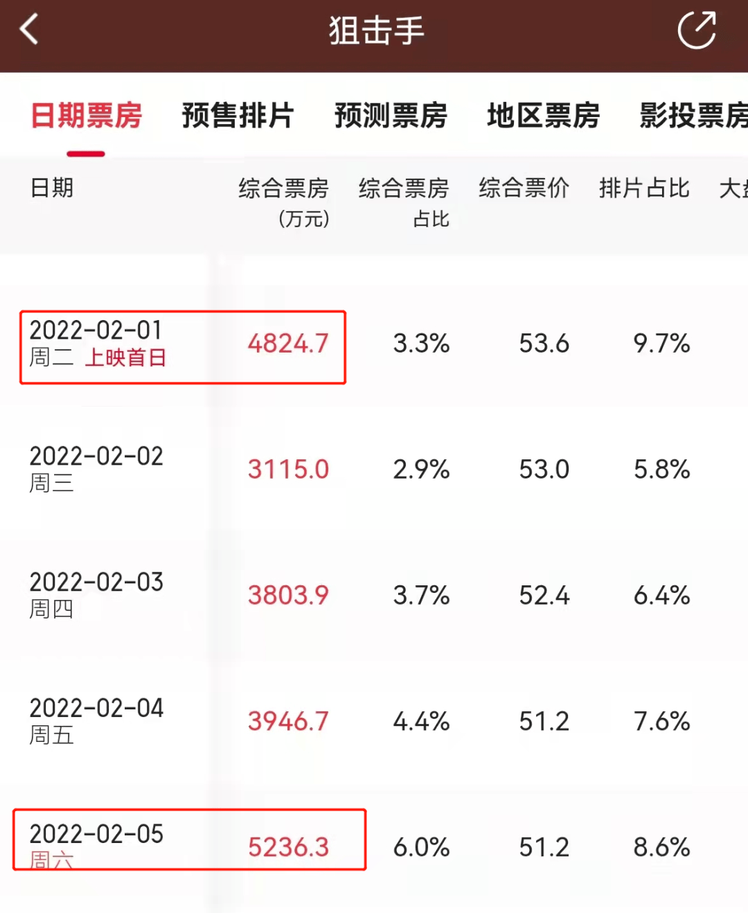 根据猫眼专业版数据显示,《狙击手》2月5日的票房共计5236.3万元,甚至超过了上映首日的票房。