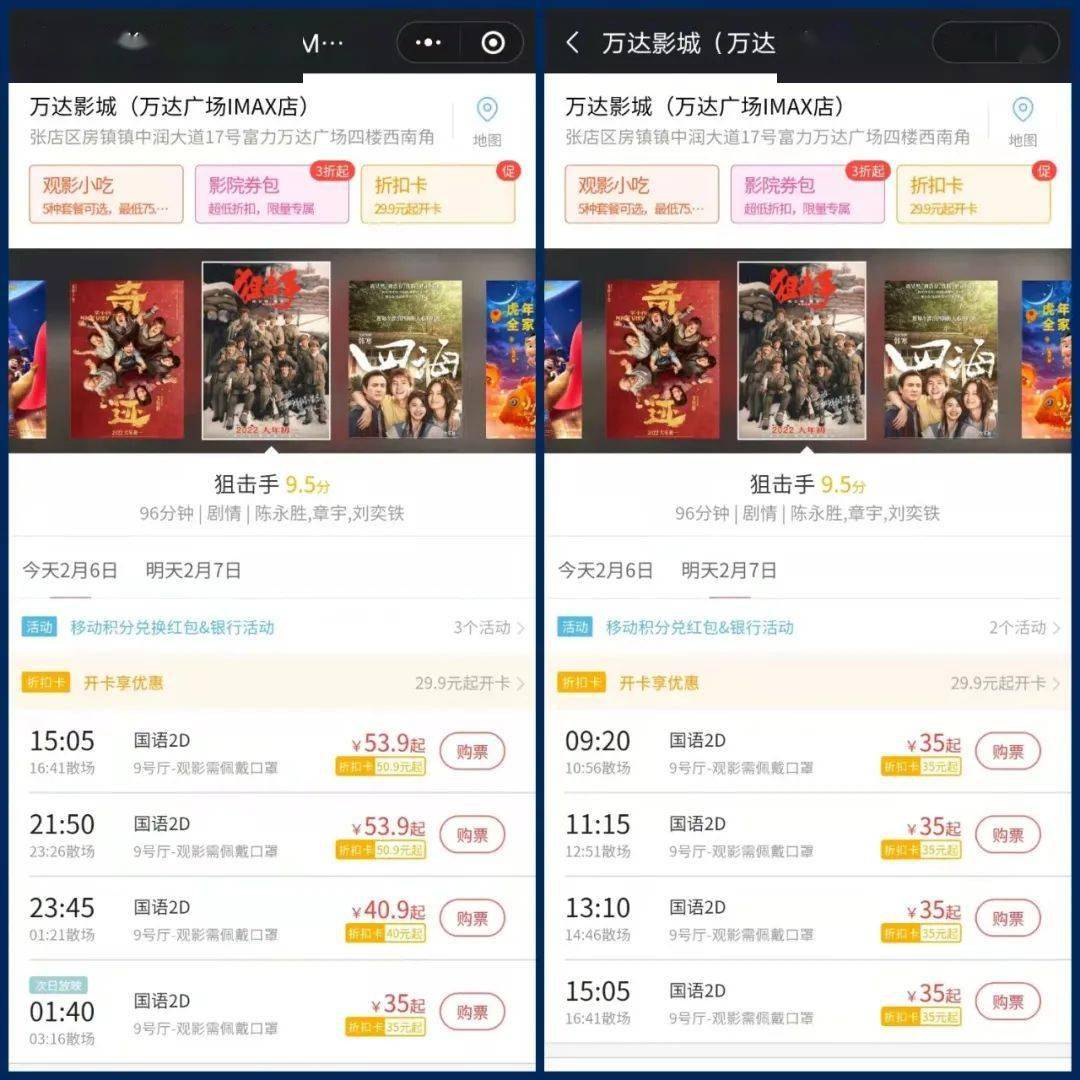 记者看到,淄博万达影城(万达广场IMAX店) 今天的票价是53.9元/张,明天票价降至35元/张。