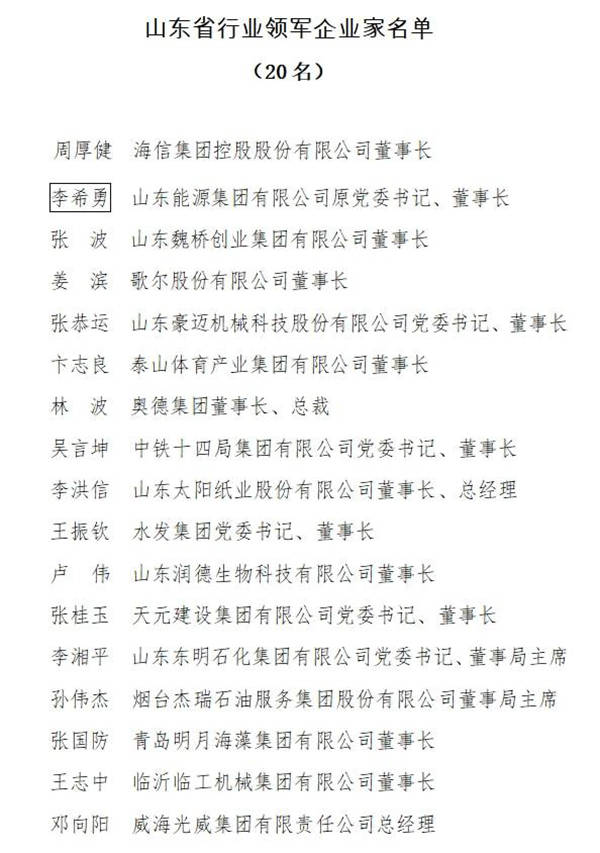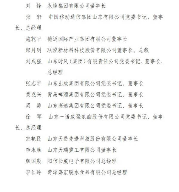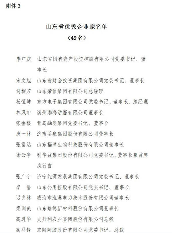 烟台杰瑞石油服务集团股份有限公司董事局主席孙伟杰、上气通用东岳汽车有限公司总经理潘洁波获评山东省行业领军企业家;东方电子集团有限公司党委书记、董事长、总经理杨恒坤,山东民和牧业股份有限公司总经理孙宪法,道恩集团有限公司董事长于晓宁获评山东省优秀企业家。