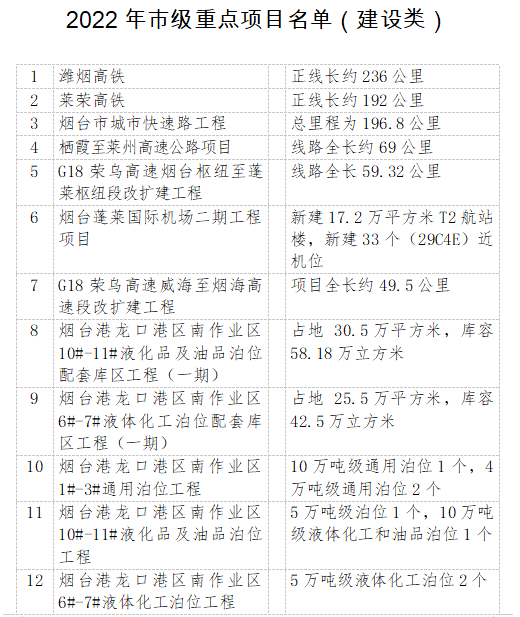 近日,烟台市发展和改革委员会印发了2022年市级重点项目(建设类)名单,包括 潍烟高铁、莱荣高铁、烟台市城市快速路工程、栖霞至莱州高速公路项目、G18荣乌高速烟台枢纽至蓬莱枢纽段改扩建工程等共计300个。