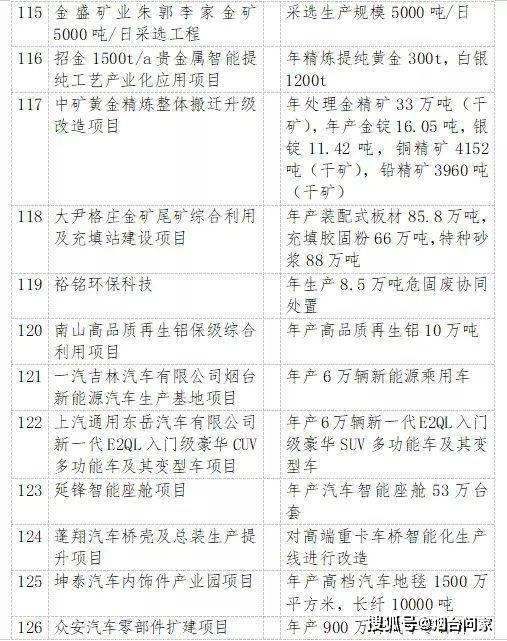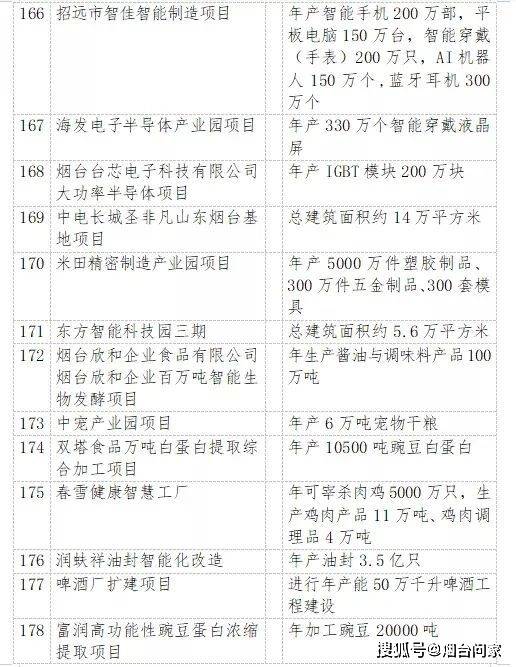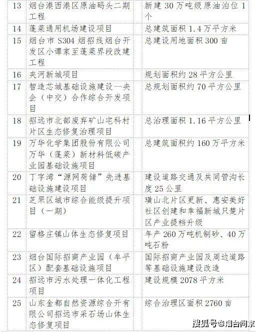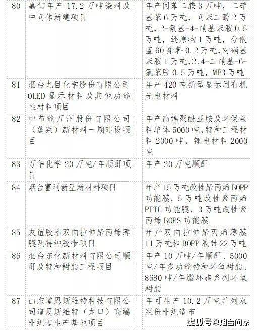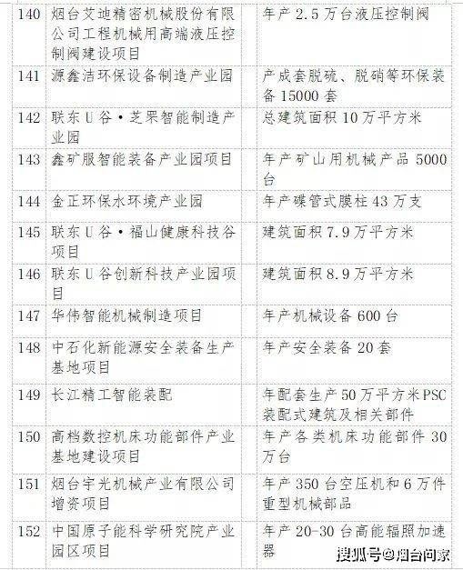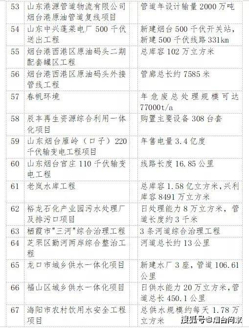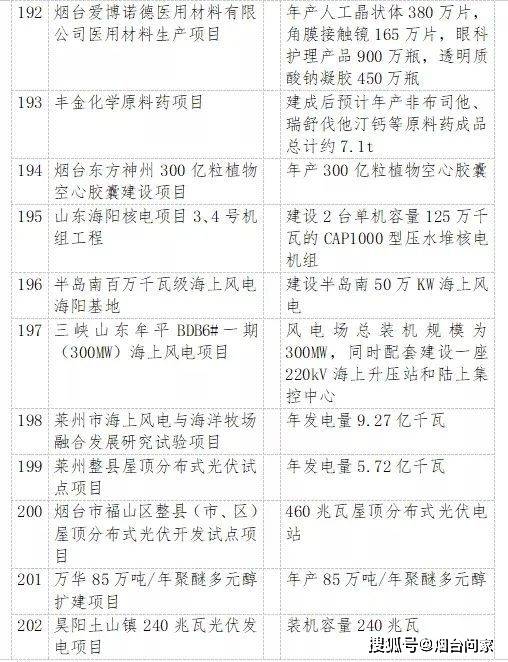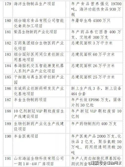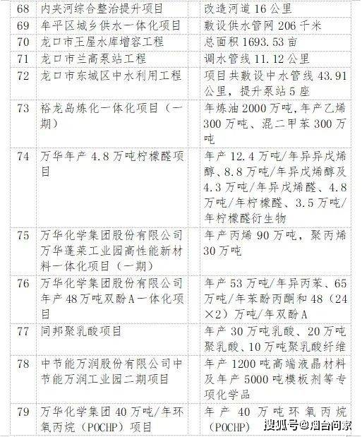烟台港西港区原油码头二期配套油罐区工程、裕龙岛炼化一体化项目(一期)、 万华化学20万吨/年顺酐项目、 一汽吉林汽车有限公司烟台新能源汽车生产基地项目、海洋生物制品生产项目、 荣昌生物新药产业化项目、干细胞与再生医学创新产业、东诚药业创新药研发及产业化基地项目……