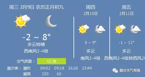 早上好,今天是2月9日,星期三,农历正月初九,数九为六九第6天。烟台天气:多云转晴,温度 -2 ~ 8℃,西南风3-4级,日出时间 06:53,日落时间 17:29,降雨量 0.0mm,湿度 47%RH。实时:晴,气温 2℃,西南风4级,湿度 38%RH,气压 1011Pa,紫外线强度 1级,能见度 30000米。
