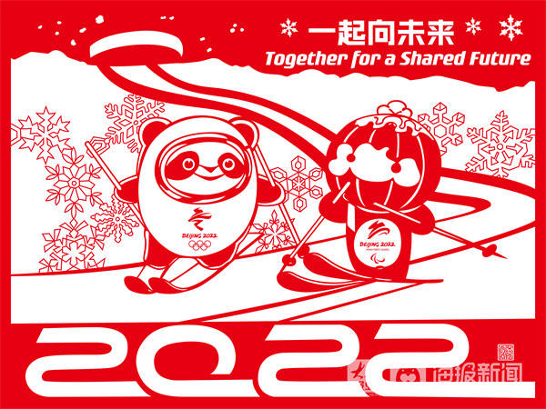 剪纸作品《一起向未来》根据第24届北京冬奥会元素改编,采用胶东窗花独特的艺术语言和象征性表现手法予以呈现。作品作者国家级非遗——烟台剪纸项目代表性传承人梁巧燕表示:“作品中吉祥物‘冰墩墩、雪容融’化身运动健儿从高空跃滑,向我们展示了团结友爱、公平竞争、相互理解的奥林匹克精神;数字‘2022’造型为冰滑梯,串联起人类永不放弃、追逐梦想的美好愿景和期盼。”