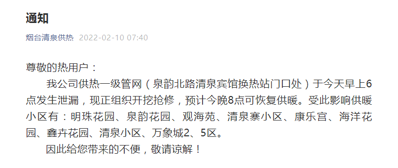 刚刚,烟台清泉供热发布通知,公司供热一级管网 (泉韵北路清泉宾馆换热站门口处)于今天早上6点发生泄漏,现正组织开挖抢修,预计今晚8点可恢复供暖。受此影响供暖小区有: 明珠花园、泉韵花园、观海苑、清泉寨小区、康乐宫、海洋花园、鑫卉花园、清泉小区、万象城2、5区。